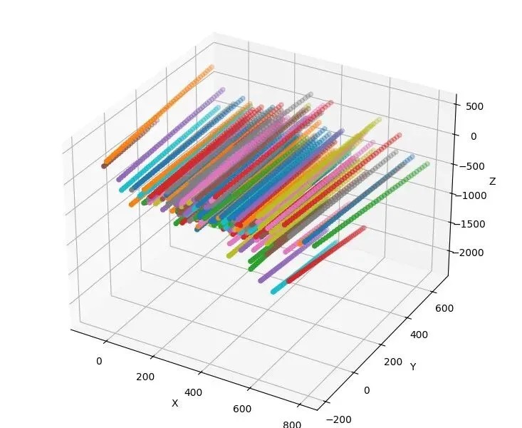 · 時空聚類:追蹤多幀圖像中的三維點位置構建三維軌跡,再按空間一致性與幀時間連續性對三維點進行分簇,合并距離接近、變化趨勢一致的點形成連續軌跡,刪除連續幀中出現次數小于閾值的“短軌跡”,以剔除不穩定或偶然出現的噪聲點,得到初步篩選后的有效三維軌跡集合。
